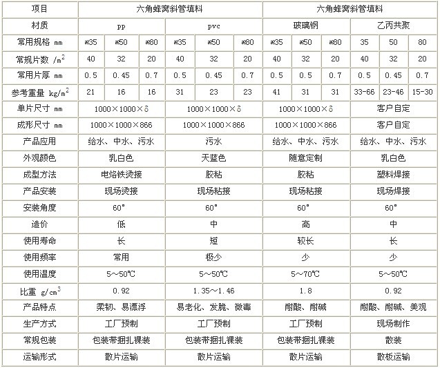 六角形蜂窝填料(斜管填料)材质有聚丙烯、聚氯乙烯、玻璃钢三种。组装形式的斜管和直管两种形式。