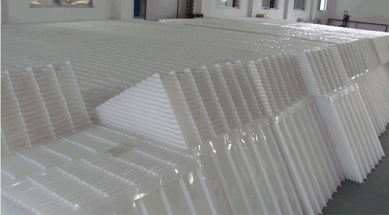 斜板填料主要由共聚及聚丙烯材料混合制成。从浅层理论的基础讲,在斜板上部设置沉淀距离合理的沉淀段,在下部控制斜板的几何形状,使斜板下部形成稳定的接触絮凝段,通过接触作用和浅池沉淀机理达到矾花与水分离的目的。各种间距斜板填料均是通过不同高度的塑料肋条来支撑斜板片,肋条与斜板热熔焊接,每两层斜板片之间需要多根肋条支撑,组装工艺复杂,而且传统斜板内部水流流道成矩形,常适用于上向流沉淀池。 斜板填料规格参考表(备注:斜长为1m计算) 片厚(单位:mm) 平板(单位:张) 重量(单位:kg) 肋条(单位:根) (板间距)25 0.8 32 33 7 1 32 39 7 (板间距)28 0.8 30 32 7 1 30 37 7 (板间距)30 0.8 28 30 7 1 28 35 7 (板间距)50 1 18 26 7 (板间距)80 1.5 11 25 7 (板间距)100 2 8 24 7
